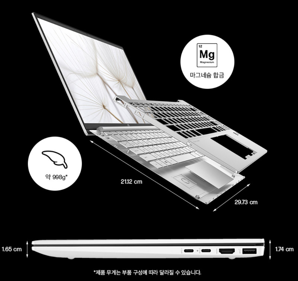 HP 옴니북7 에어로13은 무게가 998g입니다. 그런데 이 숫자만으로는 실감이 나지 않습니다. 매장에서 들어보면 놀랍습니다. 페트병 하나보다 가볍습니다.